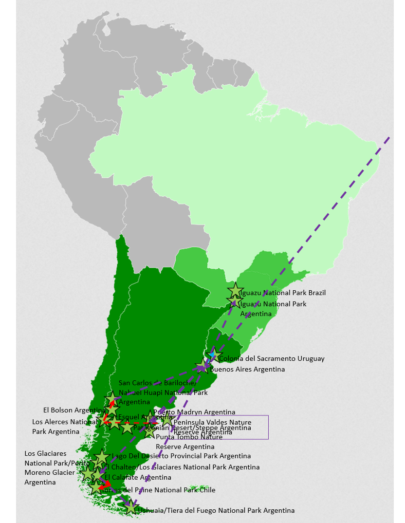 The map beneath shows South America where I travelled in 2023, mainly through Argentinian Patagonia, but with some detours into Uruguay, Chile and Brasil. I flew from Amsterdam in via Madrid to Buenos Aires, then went took a flight to Trelew, to visit the east coast at the Valdes Peninsula. Next by bus through the Patagonian desert to Esquel and on through the Los Alerces National Park and the Cholila Valley to El Bolson. Further north to the Nahuel Huapi National Park where I stayed in San Carlos de Bariloche. A flight via Buenos Aires to El Calafate was next and from there I travelled north by bus to El Chalten and the Los Glaciares NP and the Lago del Desierto Provincial Park. Next back to El Calafate and visiting the Los Glaciares NP at the Perito Moreno Glacier. Then through the Patagonian desert to Chile and the Torres del Paine NP. Back to El Calafate and then a flight to Ushuaia. Next leaving Patagonia by flight to Buenos Aires. By boat a visit to Colonia del Sacramento in Uruguay and returning to Buenos Ares. Then by flight to Puerto Iguazu and visiting the Iguazu NP’s in Brasil and Argentina, before returning to Buenos Aires. Finally the flight home via Madrid. The green star symbols represent specific travel locations or travel sections that The Wandelgek visited or travelled.